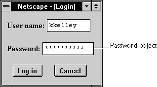 The HTML INPUT tag, with "password" as the value of the TYPE attribute. For a given form, the JavaScript runtime engine creates appropriate Password objects and puts these objects in the elements array of the corresponding Form object. You access a Password object by indexing this array. You can index the array either by number or, if supplied, by using the value of the NAME attribute.
