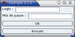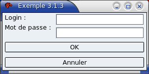 Vous pouvez ajouter autant d'élément que vous le souhaitez à l'intérieur de la boîte, y compris d'autres boîtes. Dans le cas d'une boîte horizontale, chaque élément additionnel sera placé à la droite du précédent. Les éléments ne se chevauchent pas donc plus vous ajoutez d'éléments, plus large est la fenêtre. De même, chaque élément ajouté dans une boîte verticale sera placé sous le précédent. L'exemple ci-dessous montre une simple demande de login: