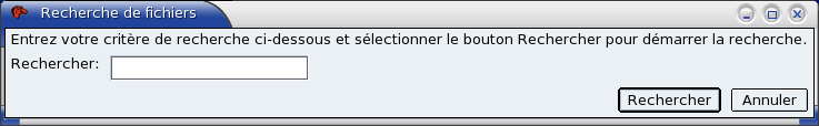 Ajoutons quelques boîtes à la boîte de dialogue de recherche de fichiers. Une boîte verticale sera ajoutée autour de tous les éléments, et une boîte horizontale sera ajoutée autour de la boîte de texte et des boutons. Le résultat sera que les boutons apparaîtront sous la boîte de texte.