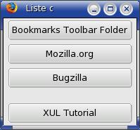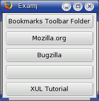 C'est mieux quand on explique avec un exemple. Prenons un exemple simple où nous voulons créer un bouton pour chaque marque-page principal. Mozilla fourni une source de données pour les marque-pages, pouvant être ainsi utilisée pour récupérer les données. Cet exemple ne récupérera que les marque-pages principaux car nous allons créer des boutons. Pour les marque-pages fils, nous devrions utiliser un élément qui affiche une hierarchie tel qu'un arbre ou un menu.